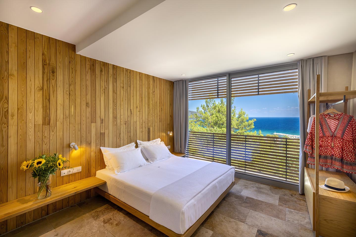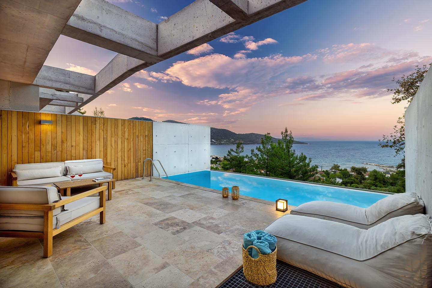 Inspired by their breathtaking surroundings, Two-Bedroom Villas feature an ultra-stylish indoor area of 80 sq.m. and an outdoor area of 110 sq.m. with stunning sea and mountain views and a spacious private heated infinity pool. The first floor of these villas features two independent bedrooms with king-size beds and bathrooms, while the second floor features a living room with a sofa bed and a fully equipped kitchen. Our villa may accommodate comfortably up to 4 adults and 2 children. Here, you’ll experience the best that Thesis Villas have to offer when it comes to your stay.